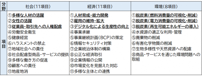 事業活動において、SDGs17ゴールに繋がる取組を「社会」「経済」「環境」の3分野から、30項目設定。