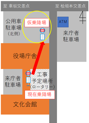 町役場庁舎のロータリー改修工事が実施されることに伴い、現在ロータリーに設置されている乗降場所を下記のとおり一時的に移設します。ご迷惑をおかけしますが、ご理解ご協力のほど、よろしくお願いいたします。